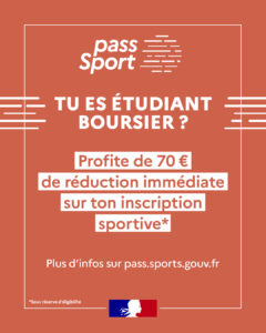 Le pass Sport est une aide financière de 70 € par étudiant boursier pour couvrir tout ou partie des frais d’inscription dans un club, association sportive ou salle de sport partenaire. Il prend la forme d’une réduction immédiate lors de l’inscription.